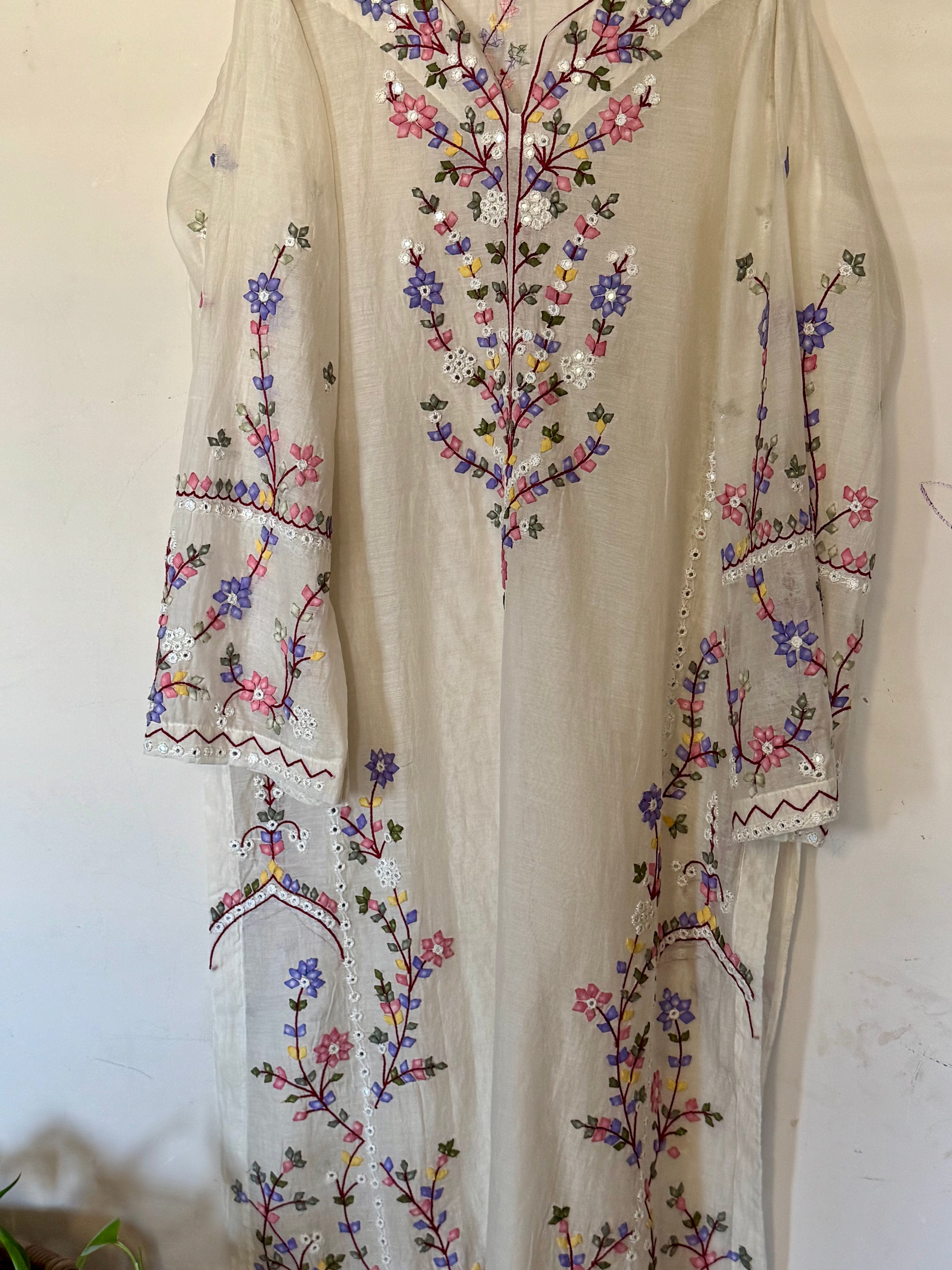 On a pristine white canvas, artistry comes alive with bursts of multicolored applique work — each hue narrating a story of festivity and craft. Chandni Rangrez is a timeless unstitched ensemble that celebrates purity and vibrance in perfect harmony. The balance of subtle elegance and playful colors makes it a versatile choice for both day and evening wear.
