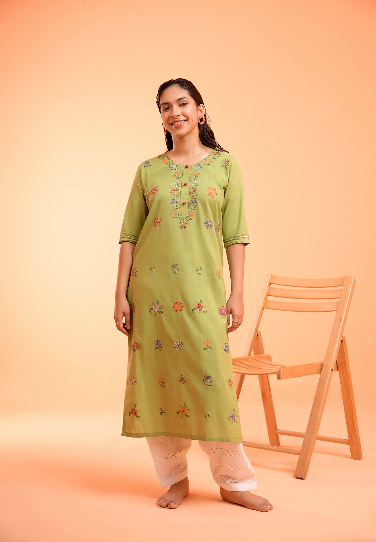 Embrace the enchantment of a flourishing garden in the "Verde Blossom" shirt, crafted from green Winter Cotton and adorned with stunning multicolor embroidery, showcasing intricate kaccha tanka stitches on both the front and back, bringing the vibrant beauty of blooming flora to life.